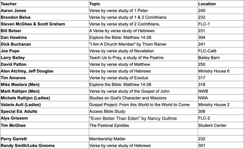 Sunday School groups meet every Sunday morning before the Main Worship Service at 8:45am. Sunday School classes primarily focus on learning, but they are a wonderful entry point into the broader fellowship of First Baptist Powell. View our current list of available Sunday School classes below.