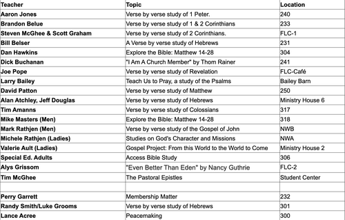 Sunday School groups meet every Sunday morning before the Main Worship Service at 8:45am. Sunday School classes primarily focus on learning, but they are a wonderful entry point into the broader fellowship of First Baptist Powell. View our current list of available Sunday School classes below.